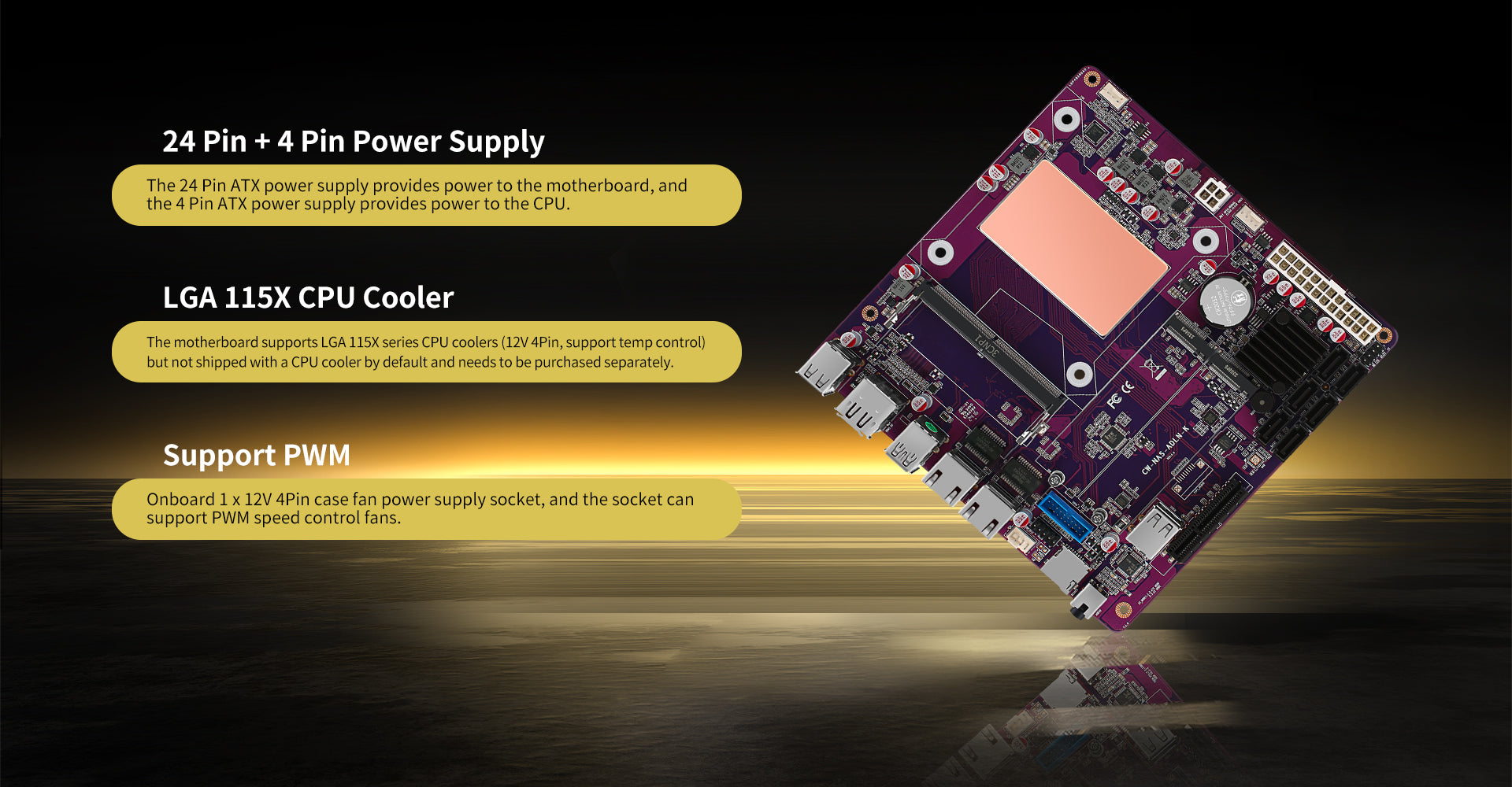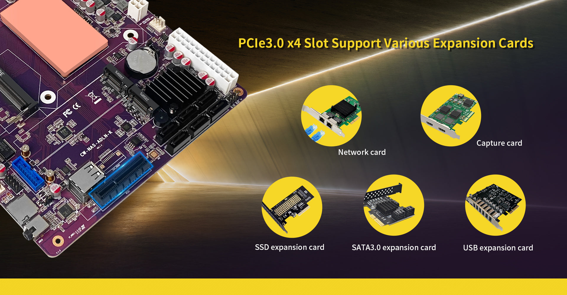 DIY Expand: 1 x PCl-E x4 slot (PCle3.0 x4 signal) supports SATA/M.2/network card and other expansions, 1 x 20Pin USB3.0 socket
