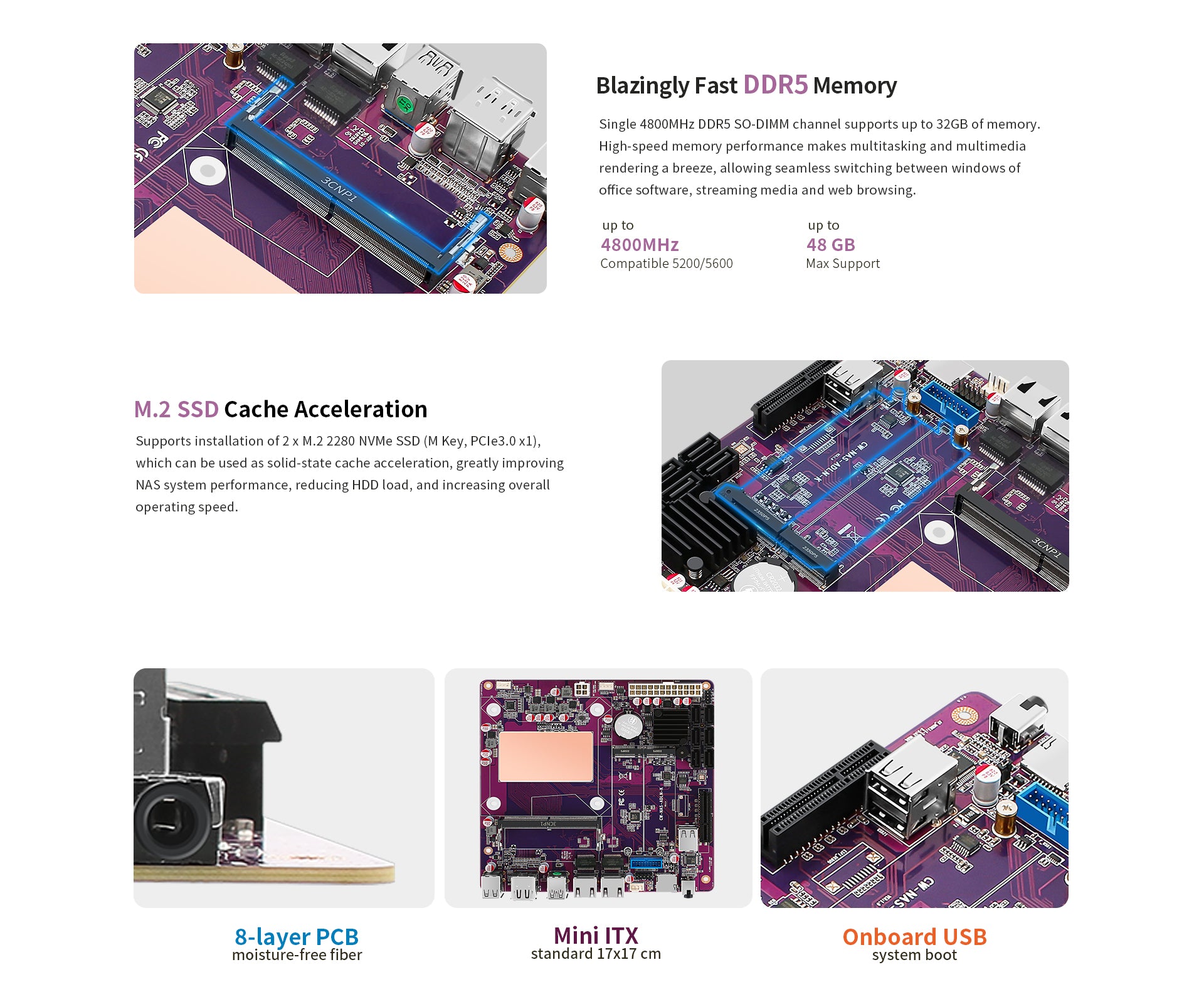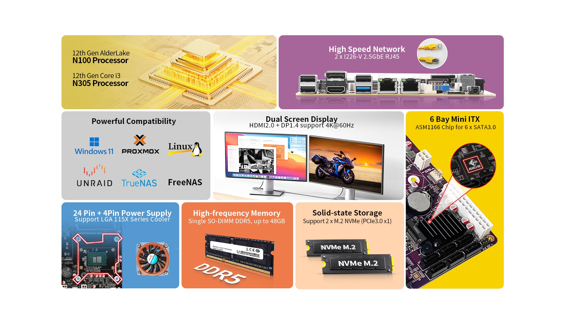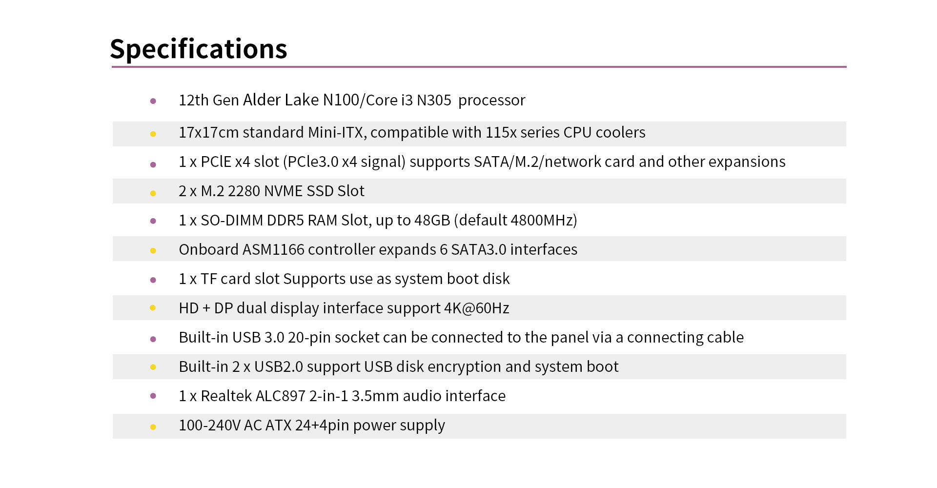 CPU: 12th Gen Core i3 N305 Processor, 8C/8T, 6M Cache, up to 3.80 GHz, TDP 15W, In-tel UHD Graphics(32EUs)