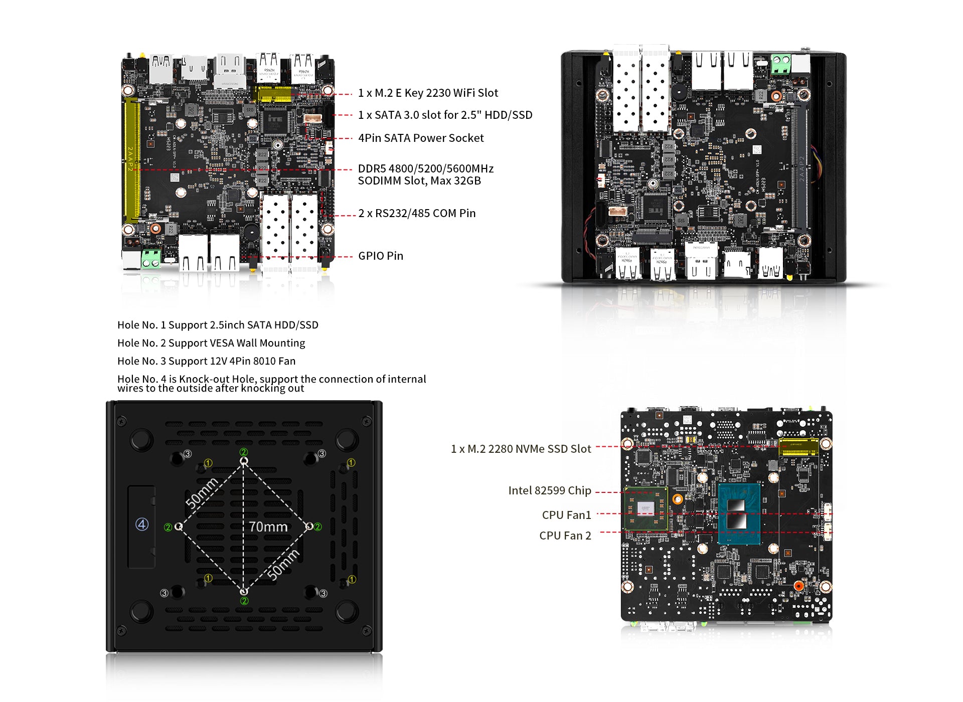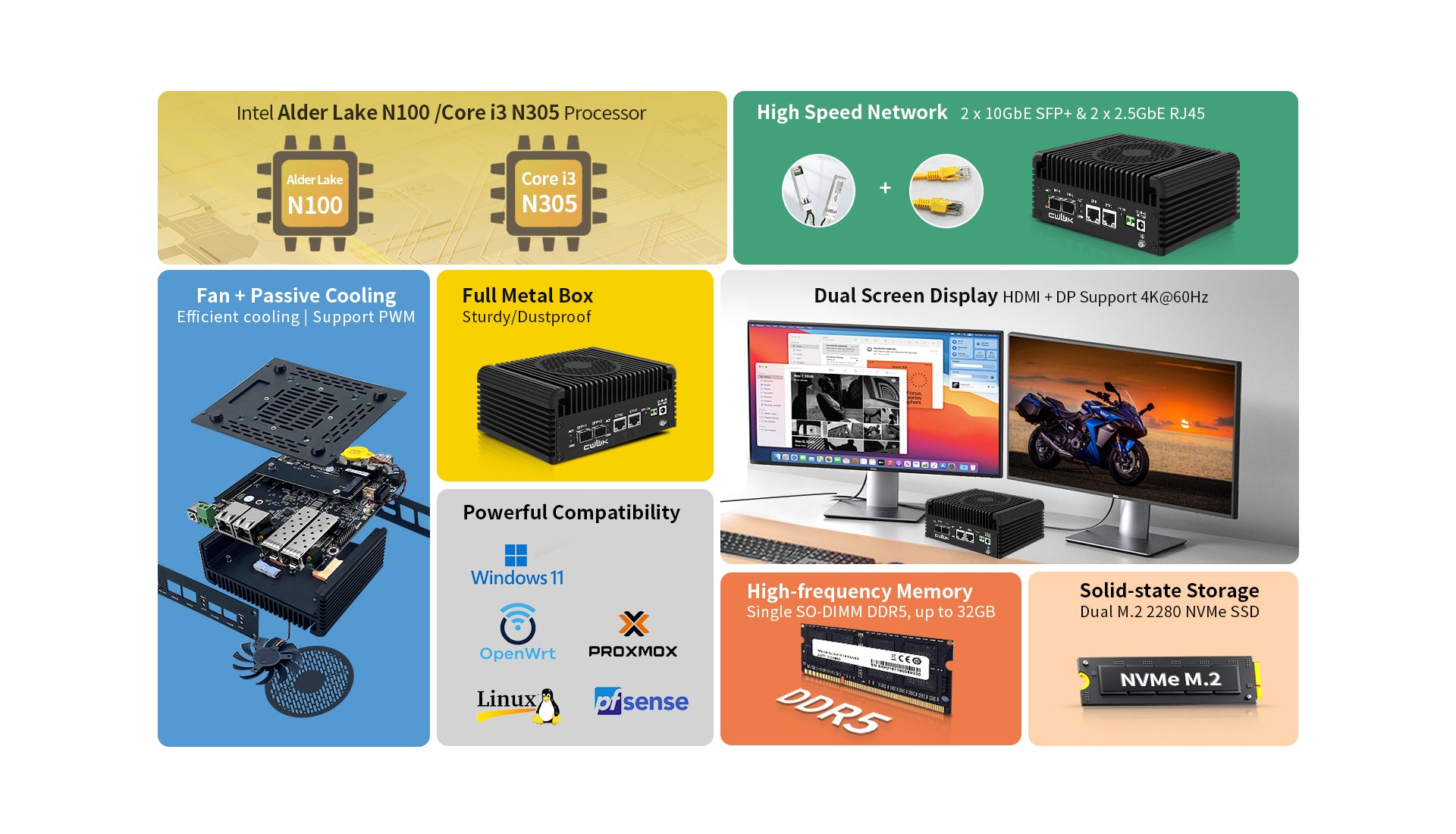 CPU: 12th Gen Core i3 N305 Processor, 8C/8T, 6M Cache, up to 3.80 GHz, TDP 6W, UHD Graphics(32EU)