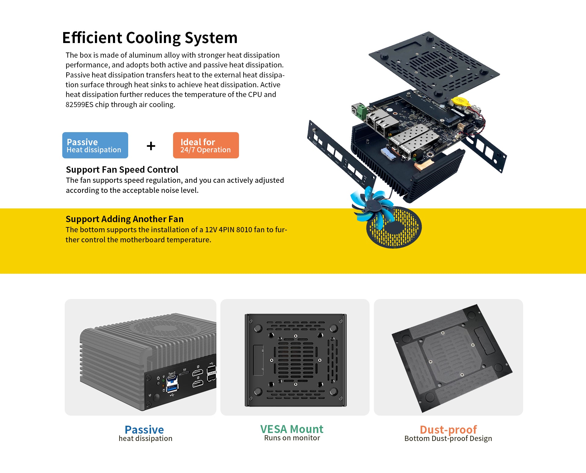 Cooling system: Combination of a passively cooled enclosure and fan-assisted cooling, 2 x fan socket, support to add 8010 temperature-control fan