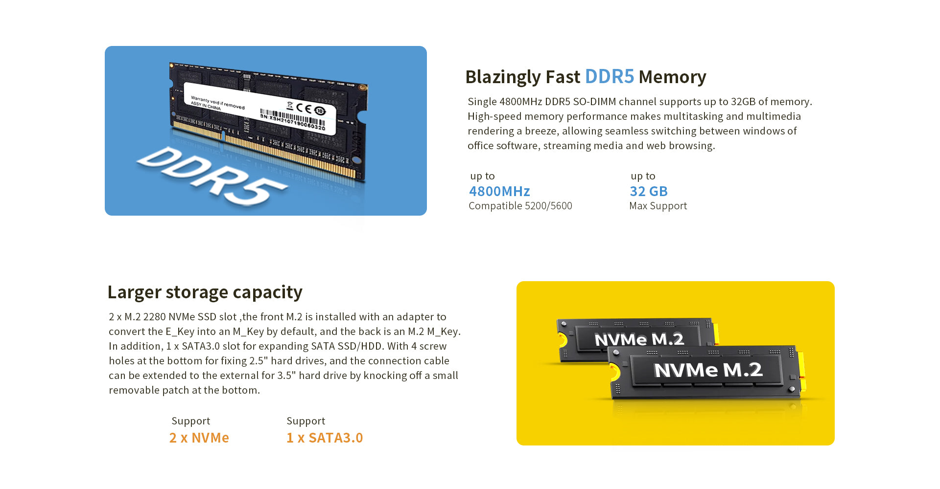 Storage: 1 x M.2 2280 NVME SSD slot, 1 x SATA3.0 for 2.5 Inch SSD/HDD