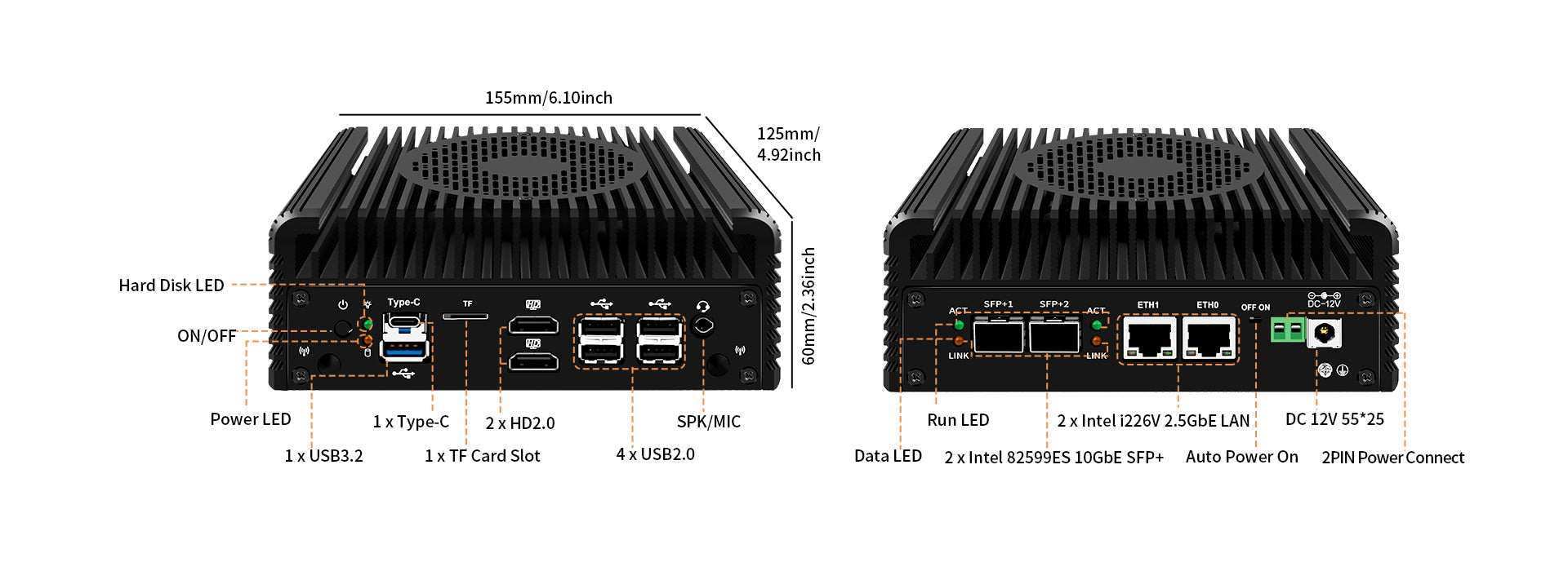 I/O Interface: Power ON/OFF, 4 x USB2.0, 1 x USB3.2 Type-A, 1 x USB3.2 Type-C, 2 x HDMl, 1 x TF slot for data storage / system boot, 4 x LAN, 1 x Phoenix 2pin, 1 x SPK/MIC, DC_IN