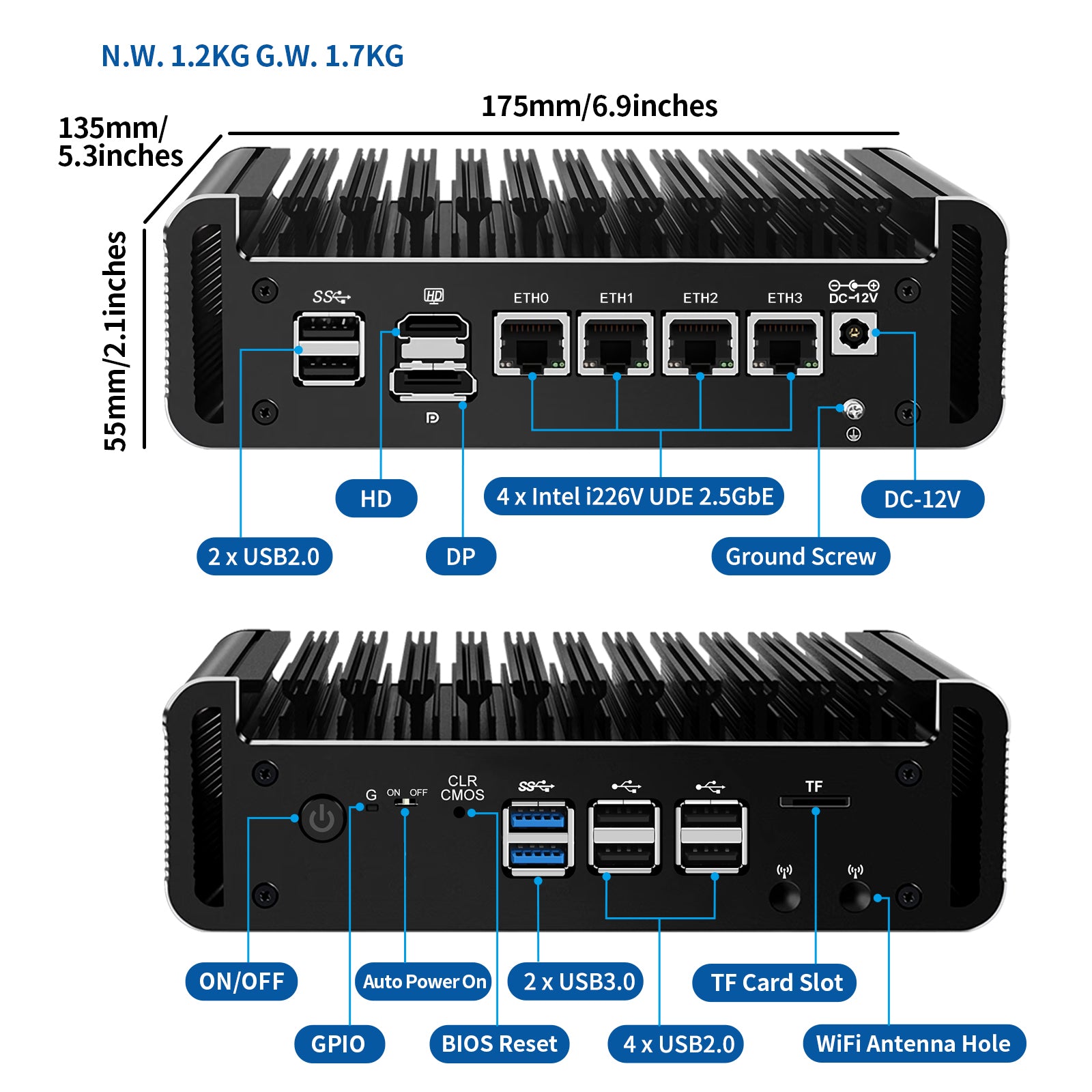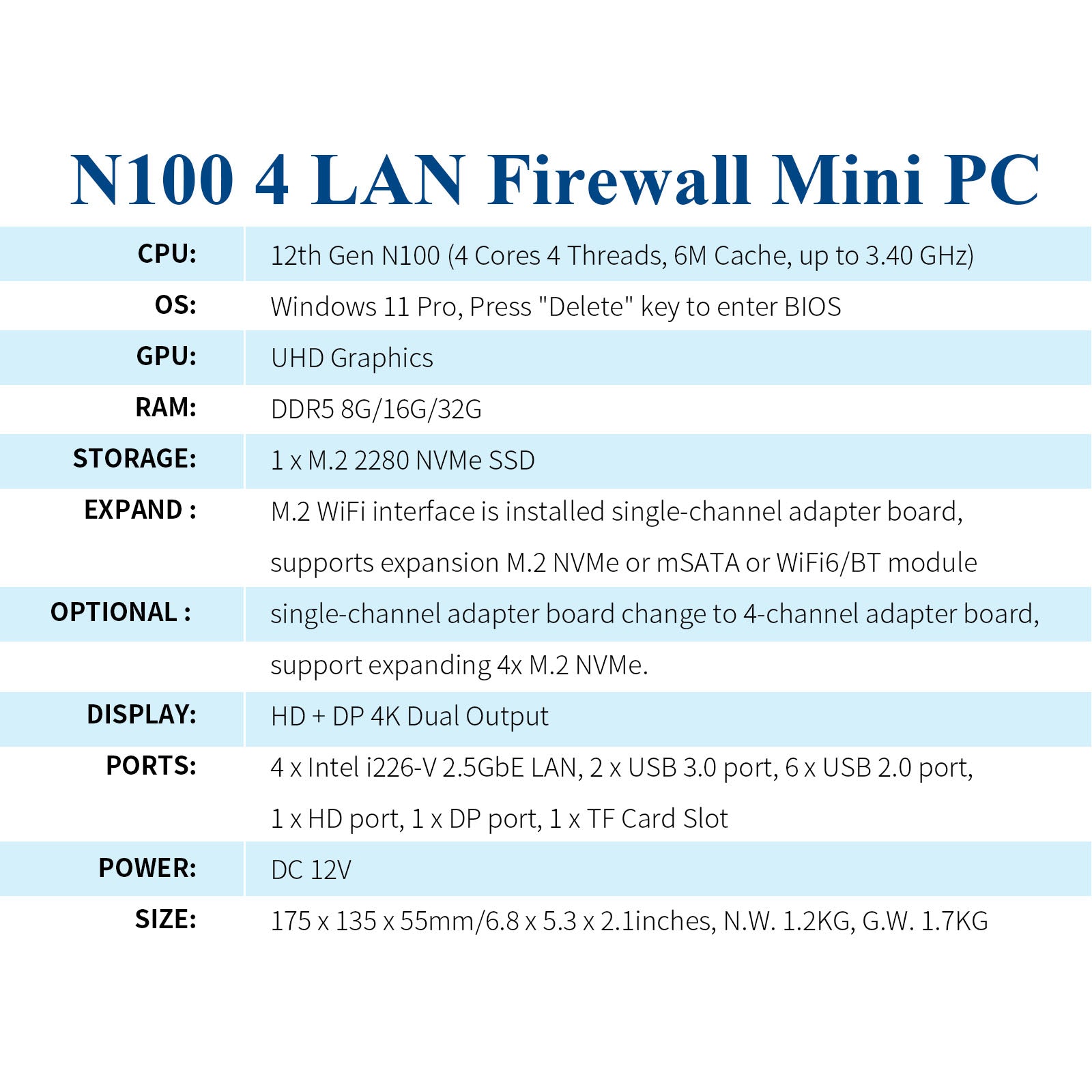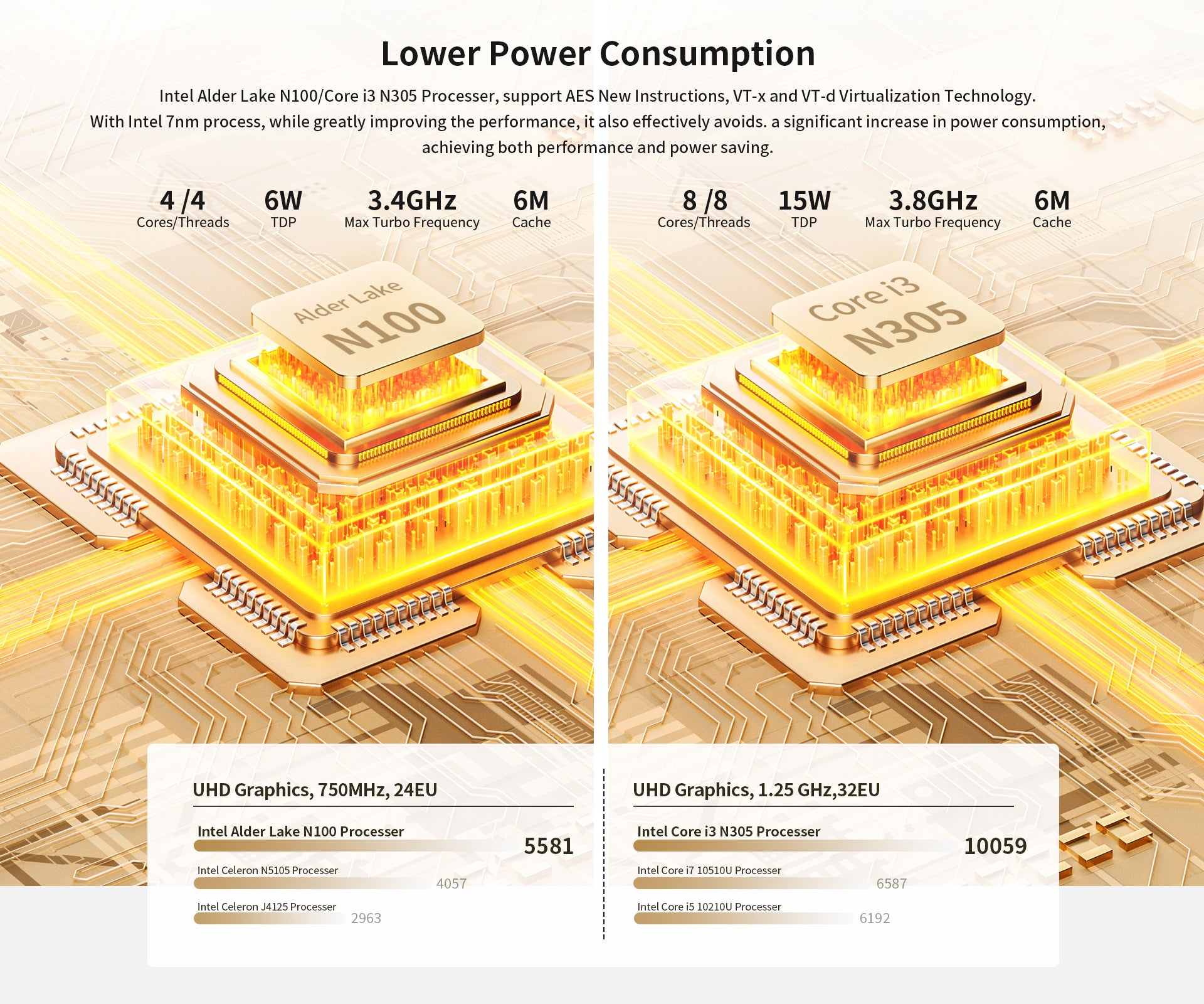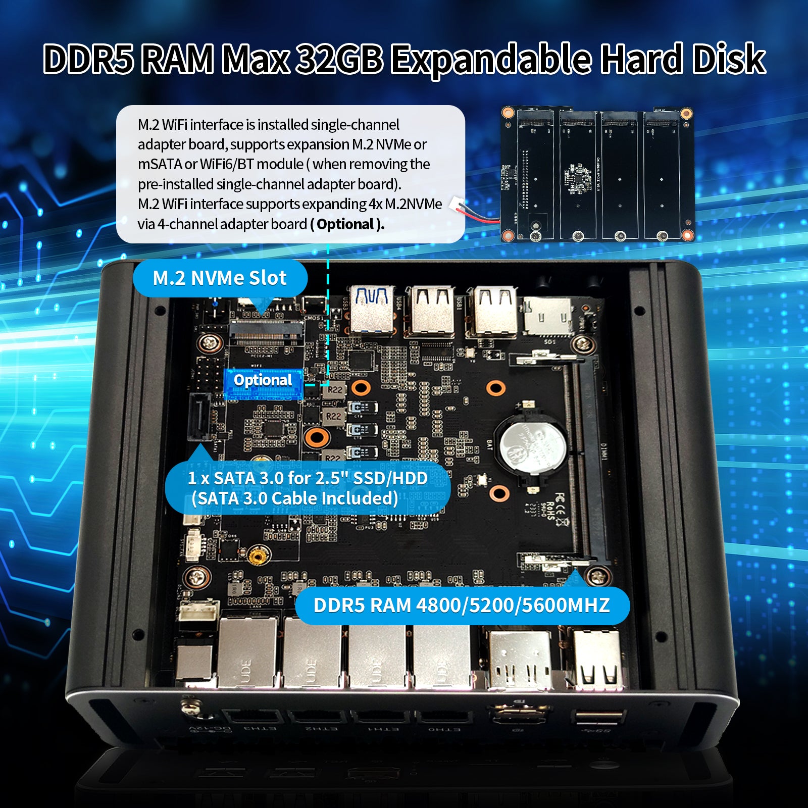 Router mini pc with Core i3 N305, 8 Cores 8 Threads, up to 3.8 GHz, TDP 15W. 1*SO-DIMM DDR5 memory 4800MHz compatible with 5200/5600MHz.