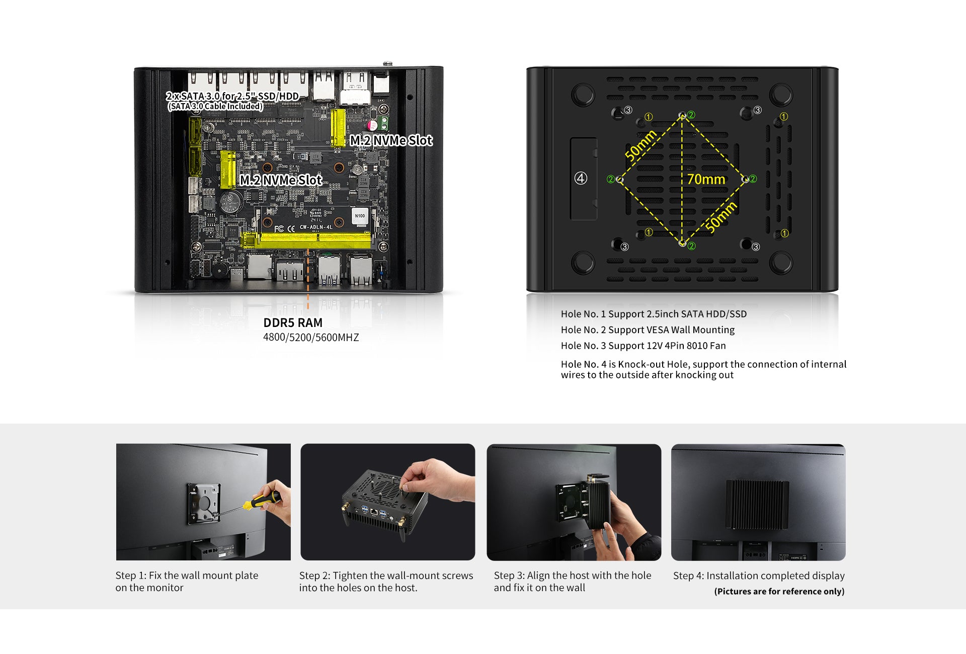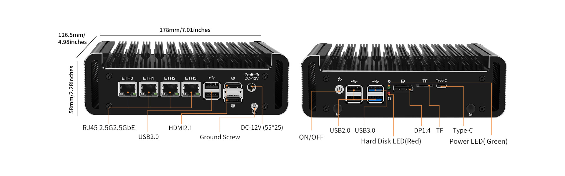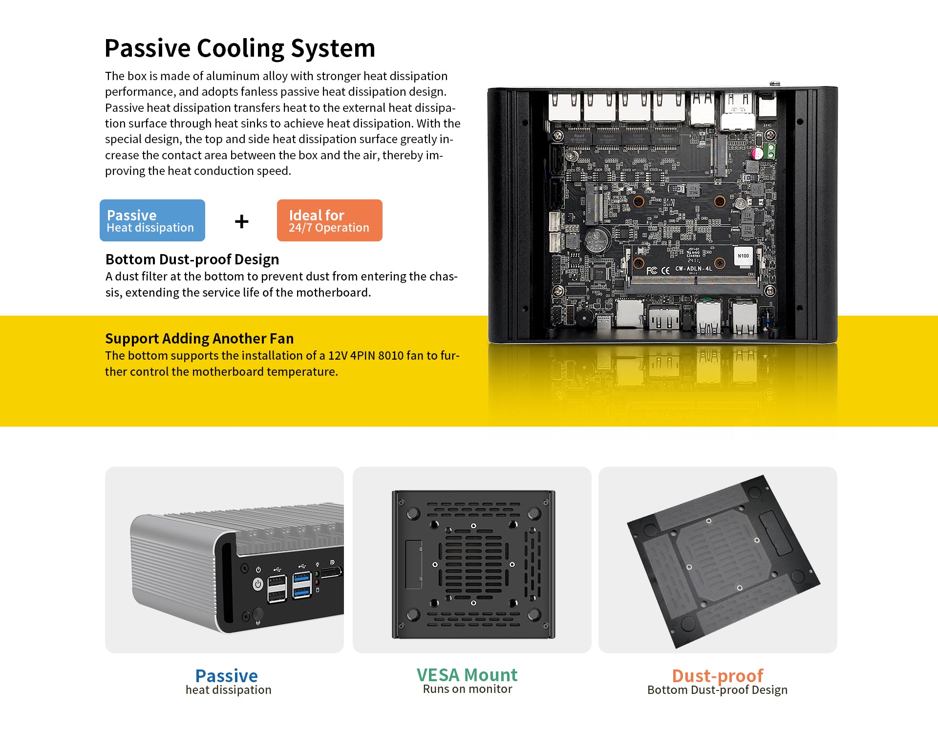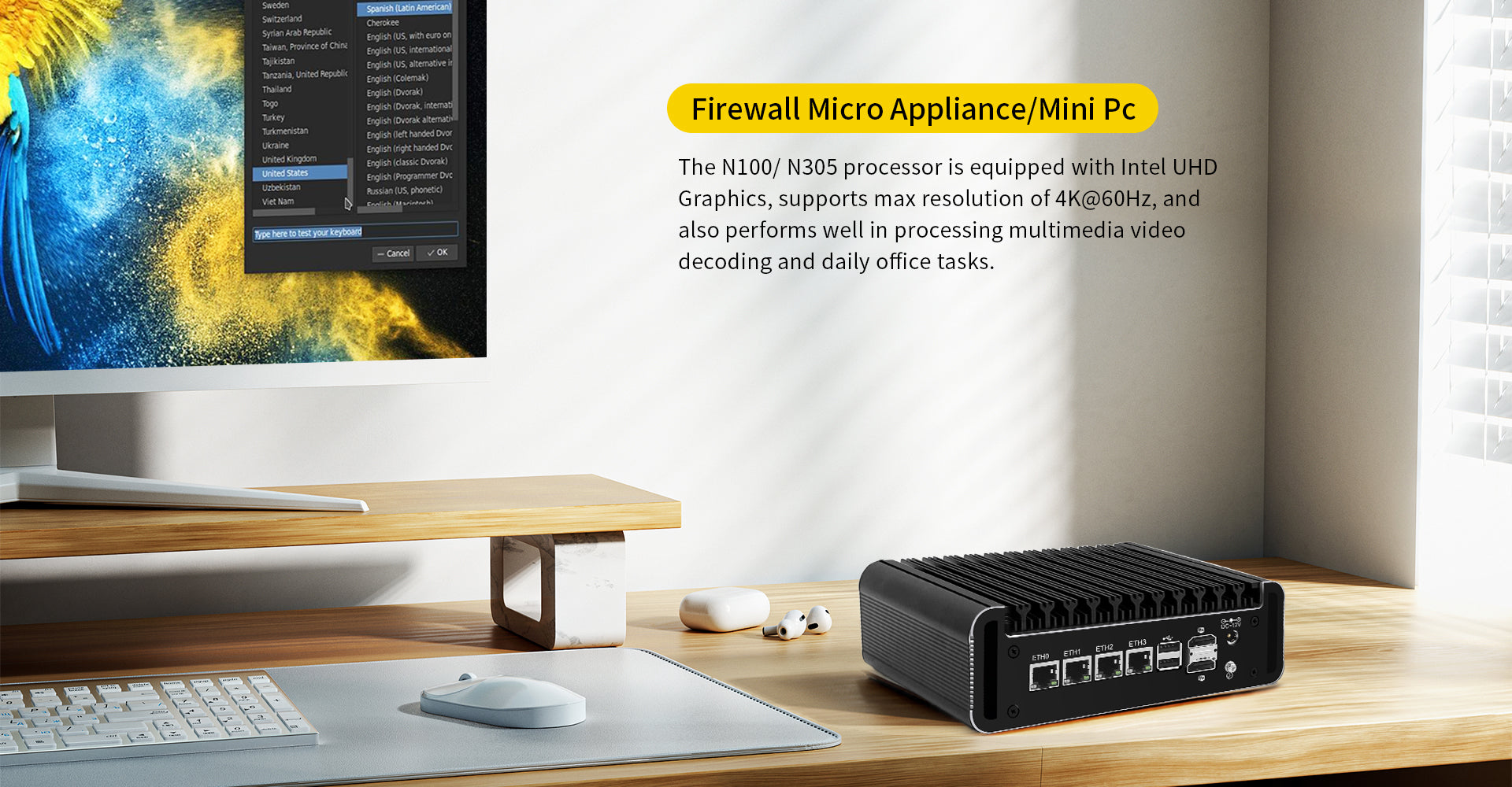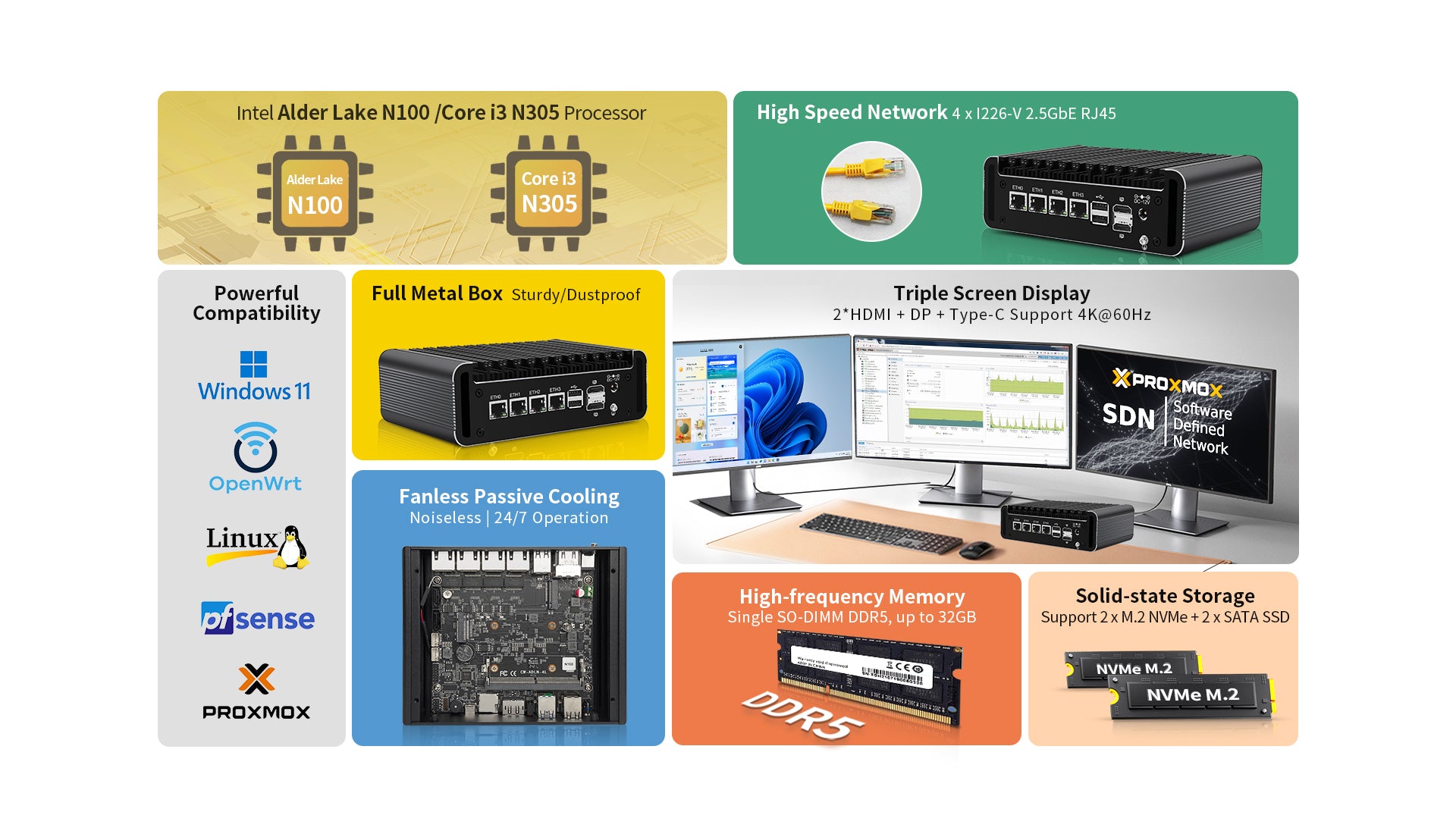 Router mini pc with Core i3 N305, 8 Cores 8 Threads, up to 3.8 GHz, TDP 15W. 1*SO-DIMM DDR5 memory 4800MHz compatible with 5200/5600MHz.