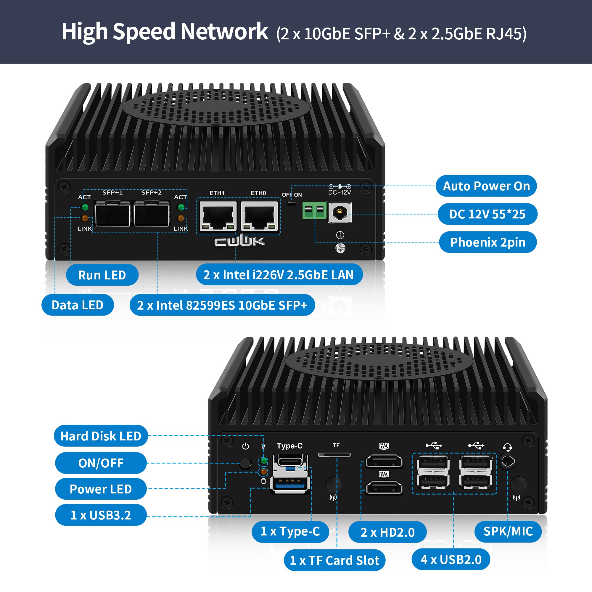 I/O Interface: Power ON/OFF, 4 x USB2.0, 1 x USB3.2 Type-A, 1 x USB3.2 Type-C, 2 x HDMl, 1 x TF slot for data storage / system boot, 4 x LAN, 1 x Phoenix 2pin, 1 x SPK/MIC, DC_IN