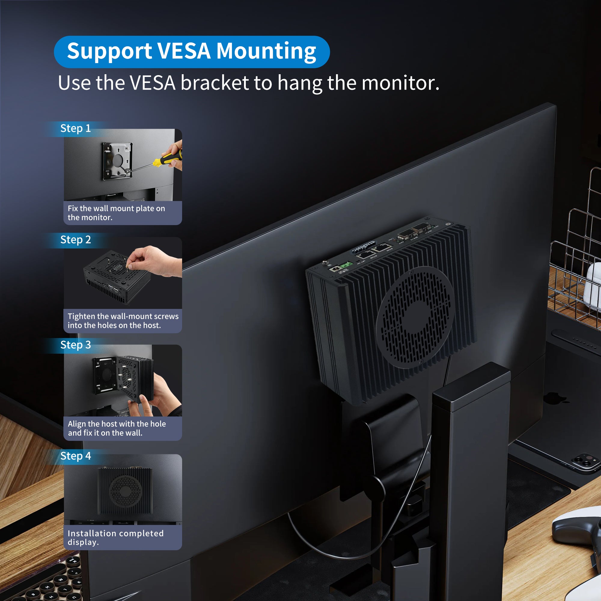 Packing List: 1 x AIOPCWA 10gb Firewall Mini PC, 1 x power adapter, 1 x VESA mount, 1 x SATA 3.0 cable, 1 x 4pin fan cable